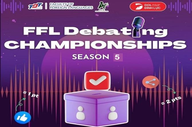 Nhằm tạo ra một sân chơi học thuật, nơi sinh viên tự tin hùng biện bằng tiếng Anh, qua đó phát triển tư duy phản biện và khả năng lập luận. FFL Debating Championships - Season 5 không chỉ giúp SV kết nối kiến thức với thực tiễn, khẳng định bản lĩnh cá nhân, mà còn giúp các em luôn tự tin tỏa sáng trong môi trường học thuật chuyên nghiệp. Vòng loại: 23/02 - 05/03/2026; Vòng bình chọn: 23/03 - 05/04/2026; Vòng chung kết: 09/05/2026.