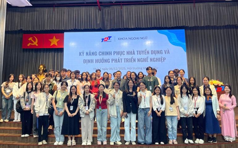 Sáng ngày 06/12/2025, tại HT 6M, Khoa Ngoại ngữ - TDTU đã tổ chức thành công chuyên đề “Kỹ năng chinh phục nhà tuyển dụng và định hướng nghề nghiệp” với phần trình bày của diễn giả khách mời Ông Trần Thanh Tươi - Giám đốc Nhân sự Công ty TNHH Jason Furniture Việt Nam (KuKa Home).