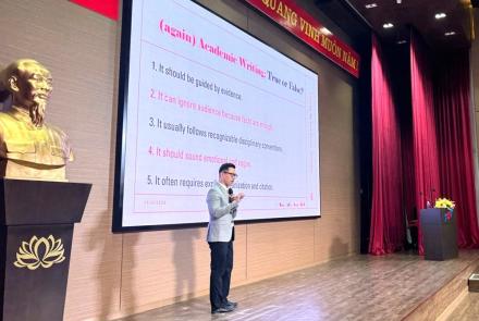 Sáng ngày 14/4/2026, tại Hội trường 10F, Khoa Ngoại ngữ - TDTU đã phối hợp với PGS. TS. Issra Pramoolsook đến từ Trường Đại học Công Nghệ Suranaree (SUT - Thái Lan) tổ chức thành công buổi Workshop chuyên sâu dành riêng cho giảng viên, sinh viên Khoa Ngoại ngữ với chủ đề “Editing in Academic Writing”.