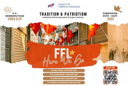 Với tinh thần trẻ trung, sáng tạo và lòng yêu nước sâu sắc, cuộc thi tiếng Anh FFL – HERE WE GO 2025 chính thức trở lại với chủ đề “Tradition & Patriotism”. Đây là sân chơi trí tuệ đặc biệt dành cho sinh viên TDTU, nơi các bạn được thể hiện quan điểm cá nhân và rèn luyện kỹ năng tiếng Anh qua nhiều hình thức đa dạng.
